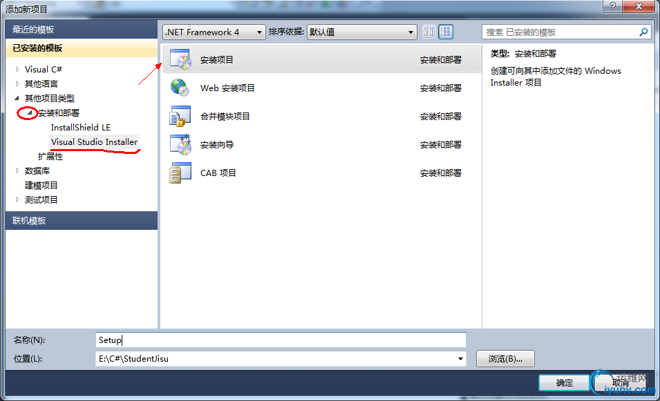 打开VS2010,打开你要打包的项目,然后右击"解决方案",”添加“,"新建项目",弹出如下图所示界面: