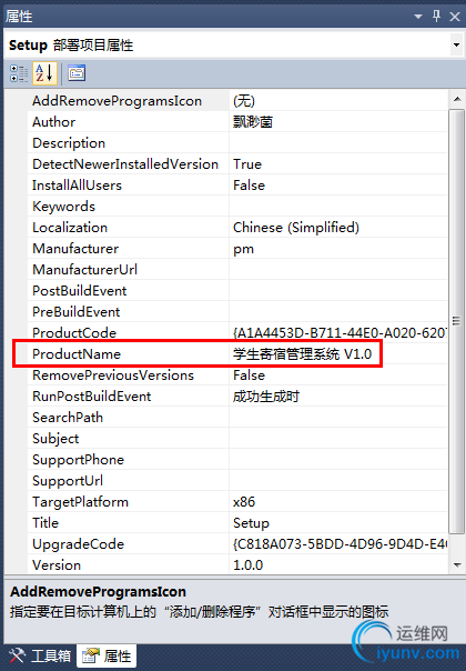 点击解决方案里面生成的”Setup“,将属性中的ProtectName改为”学生寄宿系统 V1.0 “(你的项目名字)