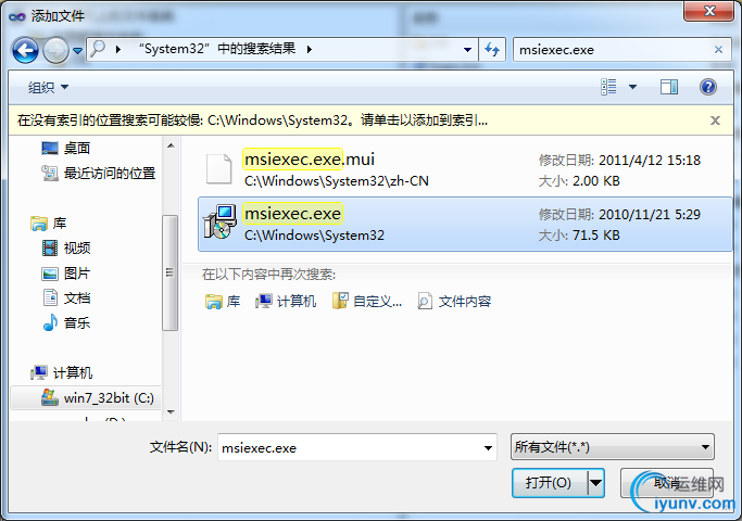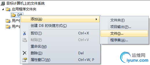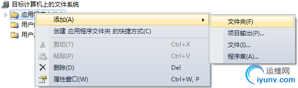 创建卸载程序。右击”应用程序文件夹“,点击”添加“,选择”文件“,然后将"C:\Windows\System32" 下面的”msiexec.exe“文件给添加进来,如果找不到,你可以直接搜。当然,你也可以再给msiexec.exe创建一个快捷方式命名为”UnInstall“。