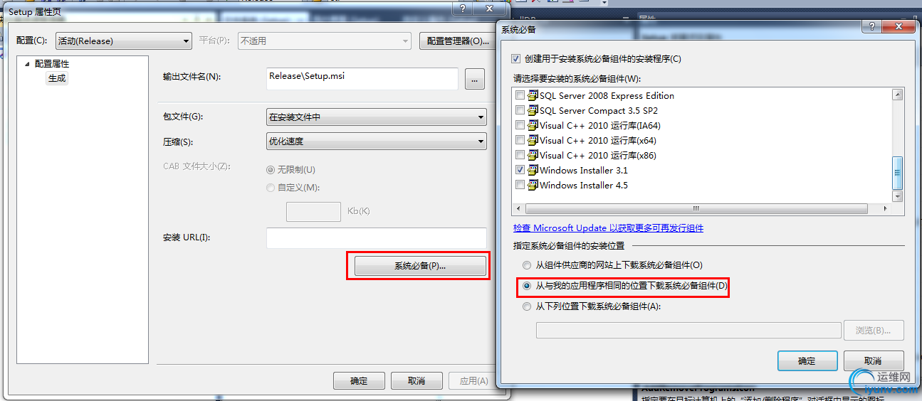 重要一点:勾选"从与我的应用程序相同的位置下载系统必备组件(D)",其实意思就是说你勾选后,生成安装项目时,在你安装项目的路径下,会有你在系统必备组件列表中勾选的组件.(系统自动完成,这一点还不错,不需要你自己去下载组件)