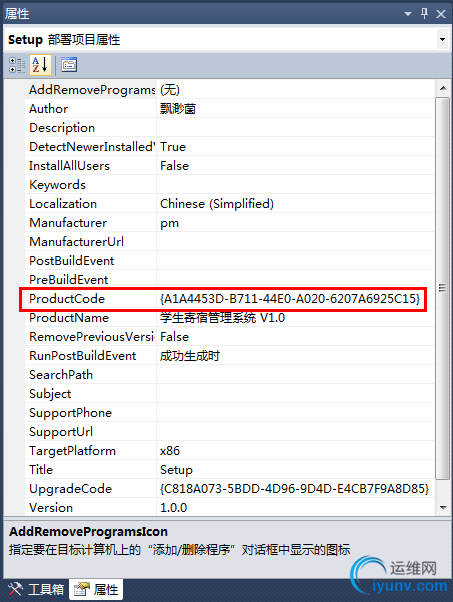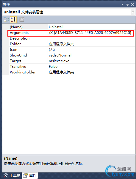 命名了快捷方式之后,将Setup属性(点击解决方案里面的setup弹出属性)ProductCode拷贝到Uninstall属性的Arguments里面: