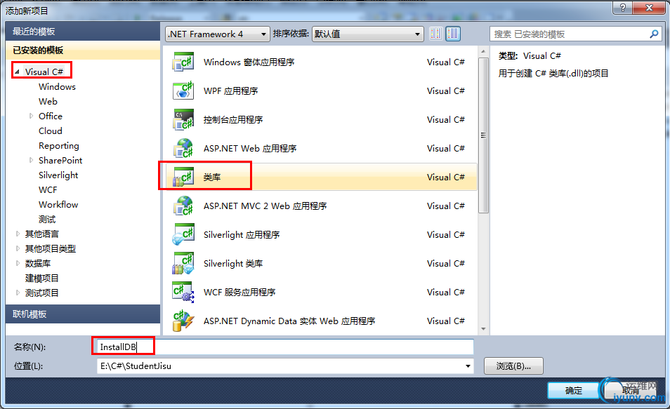 右击”解决方案“,点击”添加“,选择”新建项目“,然后新建一个C#类库,并命名为”InstallDB“。