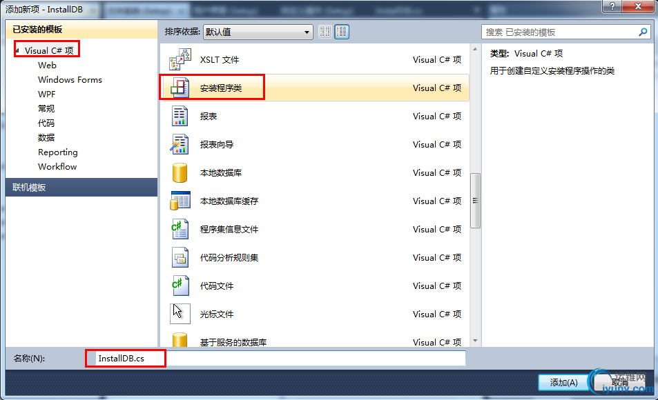 然后在弹出的界面中,选择”安装程序类“,并命名为”InstallDB.cs“。