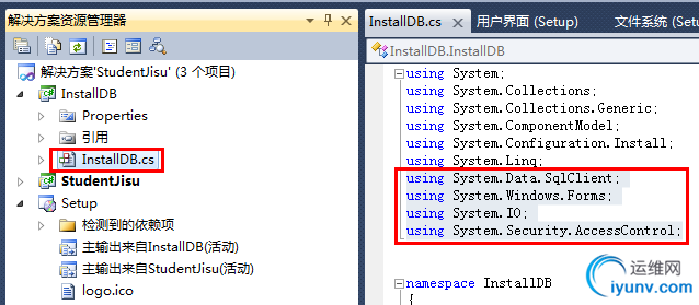 当然,要使用MessageBox()函数,需要添加using System.Windows.Forms;之外,同时需要添加System.Windows.Forms引用(具体操作:右击InstallDB,选择添加引用,选择.NET)