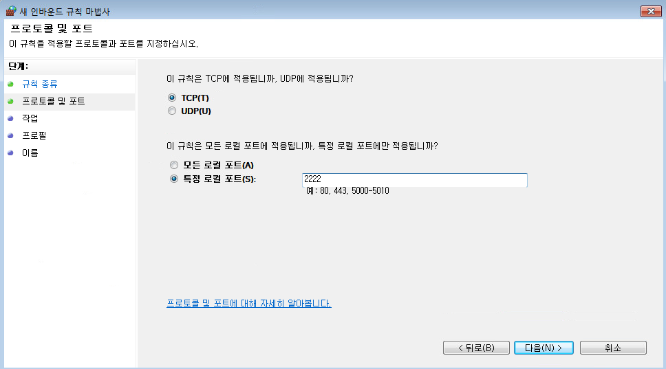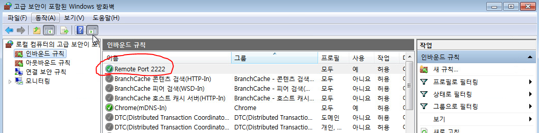 Control Panel -> Windows Firewall -> Advanced Setting -> Inbound Rule -> New Rule -> Port -> TCP and Special Port(?): 2222 -> Named "Remote Poart 2222"