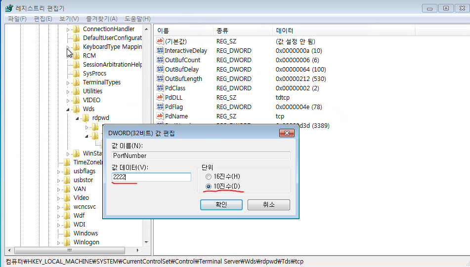 - HKEY_LOCAL_MACHINE -> SYSTEM -> CurrentControlSet -> Control -> Terminal server -> Wds -> rdpwd -> Tds -> tcp ->PortNumber