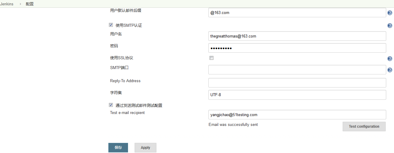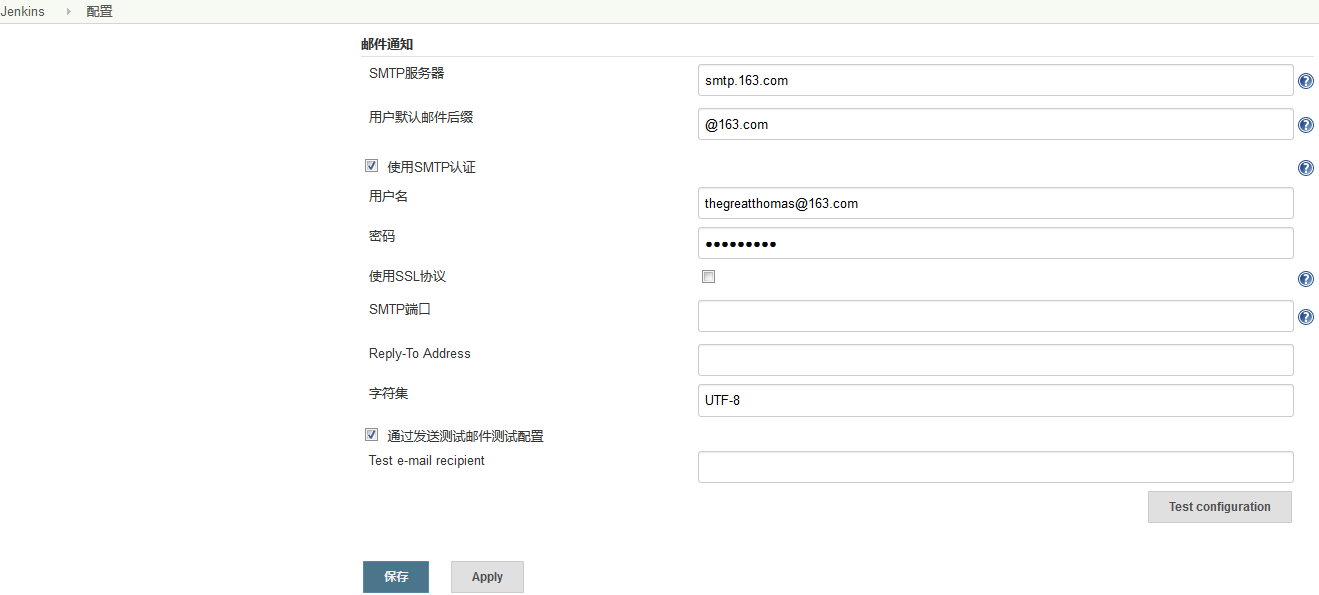 配置Test e-mail recipient,添加一个收件人邮箱,点击Test Configuration按钮测试邮件发送
